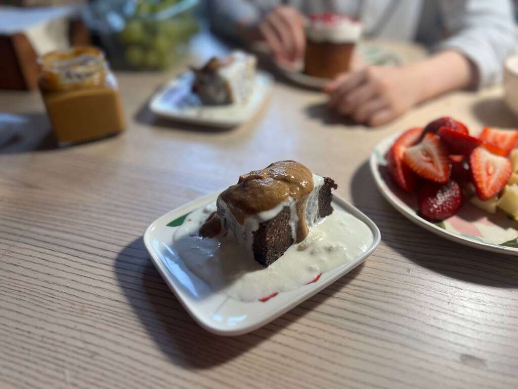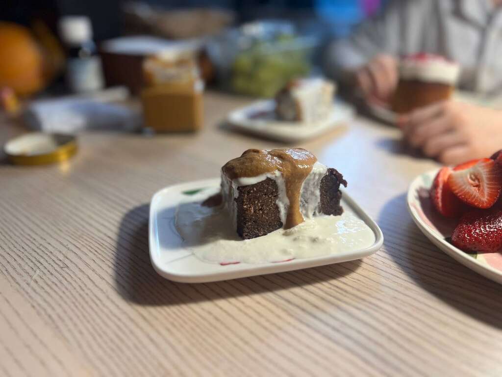 О, вот еще забыла поделиться про карамель. Она просто прекрасна: не слишком сладкая, пряная, удобная текстура, не липкая! Тут она вместе с творожно-какаошной запеканкой (по сути, чизкейк с чистым какао, без сахара) и страчателлой. Всё вместе – и для души, и для пользы (нормы протеина).