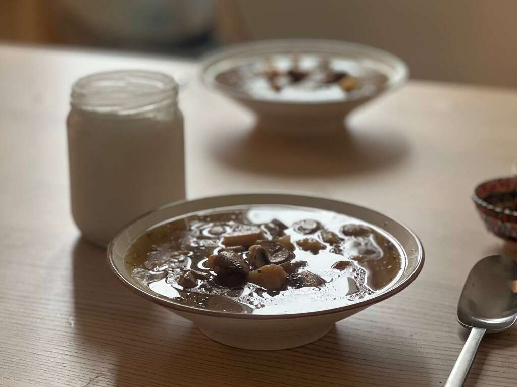 бульон сварен на костях, зелени с луком и процежен, и потом уже в него добавляю овощи, крупу, грибы и прочее.