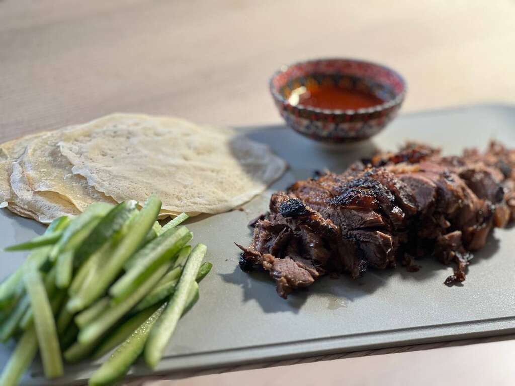 При подаче тонко нарезать соломкой огурец, в мисочку налить соус хойсин или другой азиатский соус на ваш вкус.