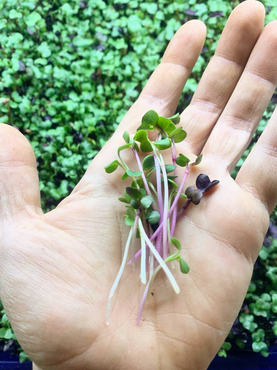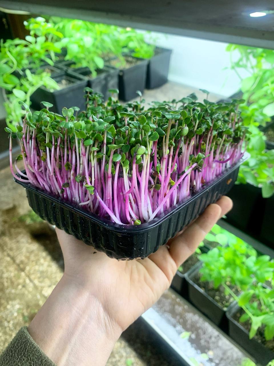 Микрозелень (проростки) редиса в контейнере с семенами.