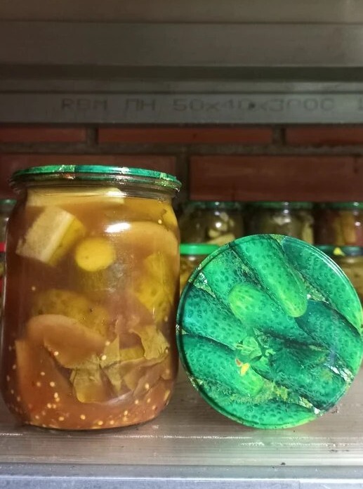 Состав: резаные огурцы, домашний кетчуп, листья хрена, семена белой горчицы, соль, сахар.