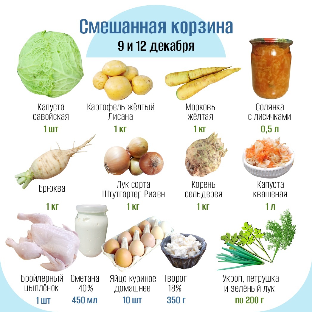 Состав овощей в корзине разнообразен и постоянно меняется, в зависимости от текущего сезона. А набор из цыплёнка, десятка яиц, творога и сметаны - постоянный.