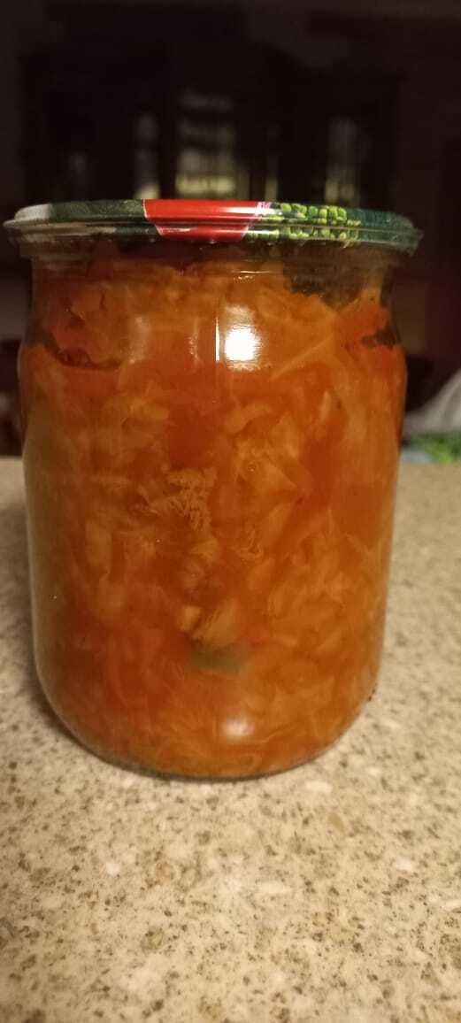 Состав: капуста, лук, морковь, лисички, перец сладкий, сахар, соль, домашний уксус, томатная паста.
